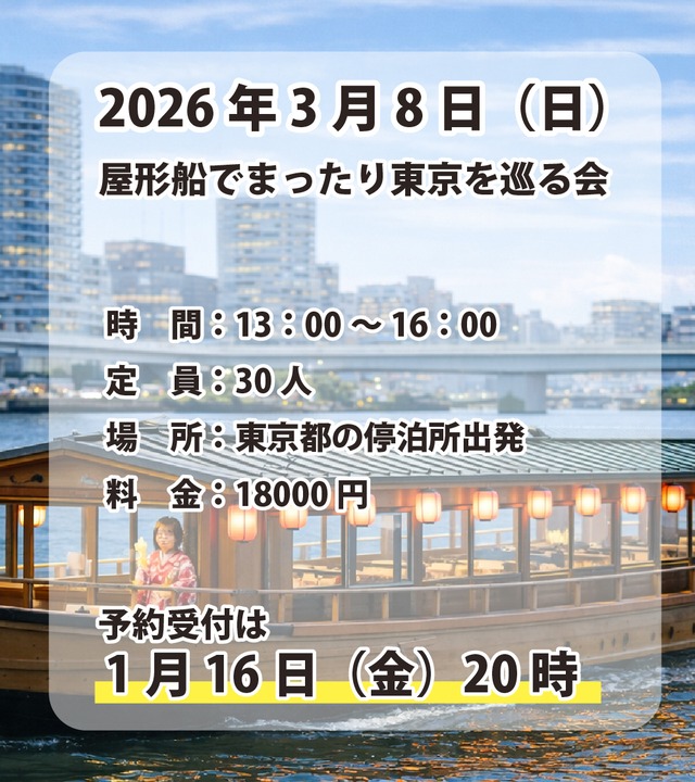 開催日:2026年3月8日(日) 時 間:13:00~16:00頃 (送迎等の関係で集合時間が早まる可能性あります) 定 員:30人 場 所:東京都の停泊所出発 料 金:18000円 屋形船でまったり東京を巡る会! 揚げたて天ぷらを堪能しつつ、楽しい時間を過ごしましょう! ゲーム大会、カラオケライブ、2ショット写真撮影会などを予定しています。 ・お食事、ソフトドリンク飲み放題込み ・アルコールの提供はございません。 ※1月16日20時より受付開始します! ※発着所などは、東京駅から30分圏内の駅集合となります。 ※詳細は2月中旬 メールにてお知らせいたします。